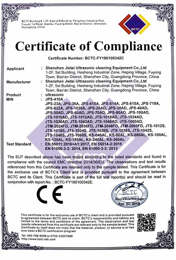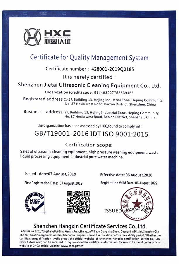 ? ? ? 公司全面實行嚴格的ISO9001:2008質(zhì)量體系管理,以創(chuàng)新著稱而躋身行業(yè)前列,所開發(fā)生產(chǎn)的各種超聲波清洗設備,先后通過CE、FCC、ROHS、等認證,產(chǎn)品專利達50多項,技術達國際同類產(chǎn)品先進水平。