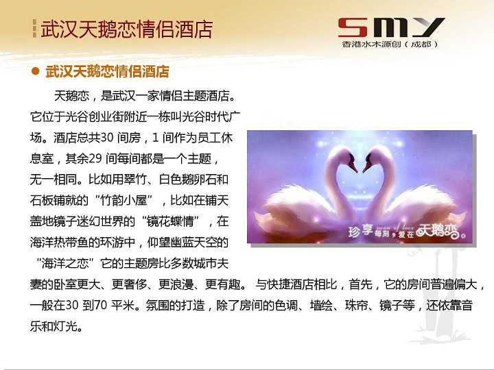 其次就是湖北武漢的這家天鵝戀情侶酒店了,以白天鵝圣潔的羽毛輝顯出情侶酒店的浪漫情懷。在愛情的面前每一個人都純潔得如同一張白紙那樣,難怪有人會說遇到了愛情你的智商就變為了“零”。愛情是美好的,無數人心中充滿對愛情的向往。