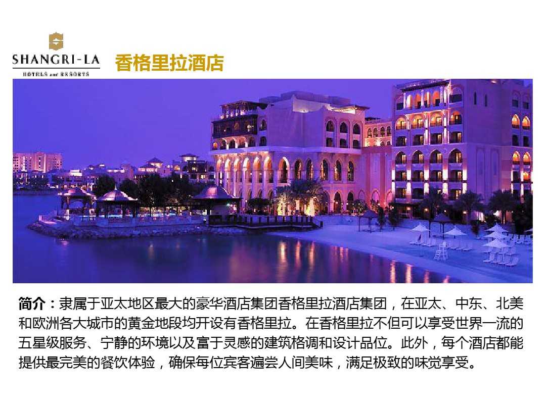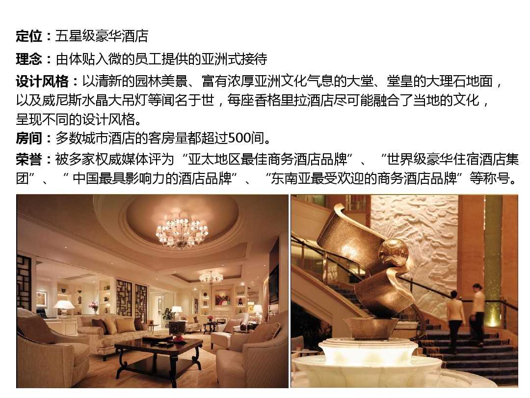 香格里拉酒店集團于上世紀70年代第一家酒店在新加坡開業以來發展至今,經過幾十年的歲月磨練,如今的香格里拉酒店集團已經是亞洲最大的豪華酒店集團,也被視為最佳的酒店管理集團之一。