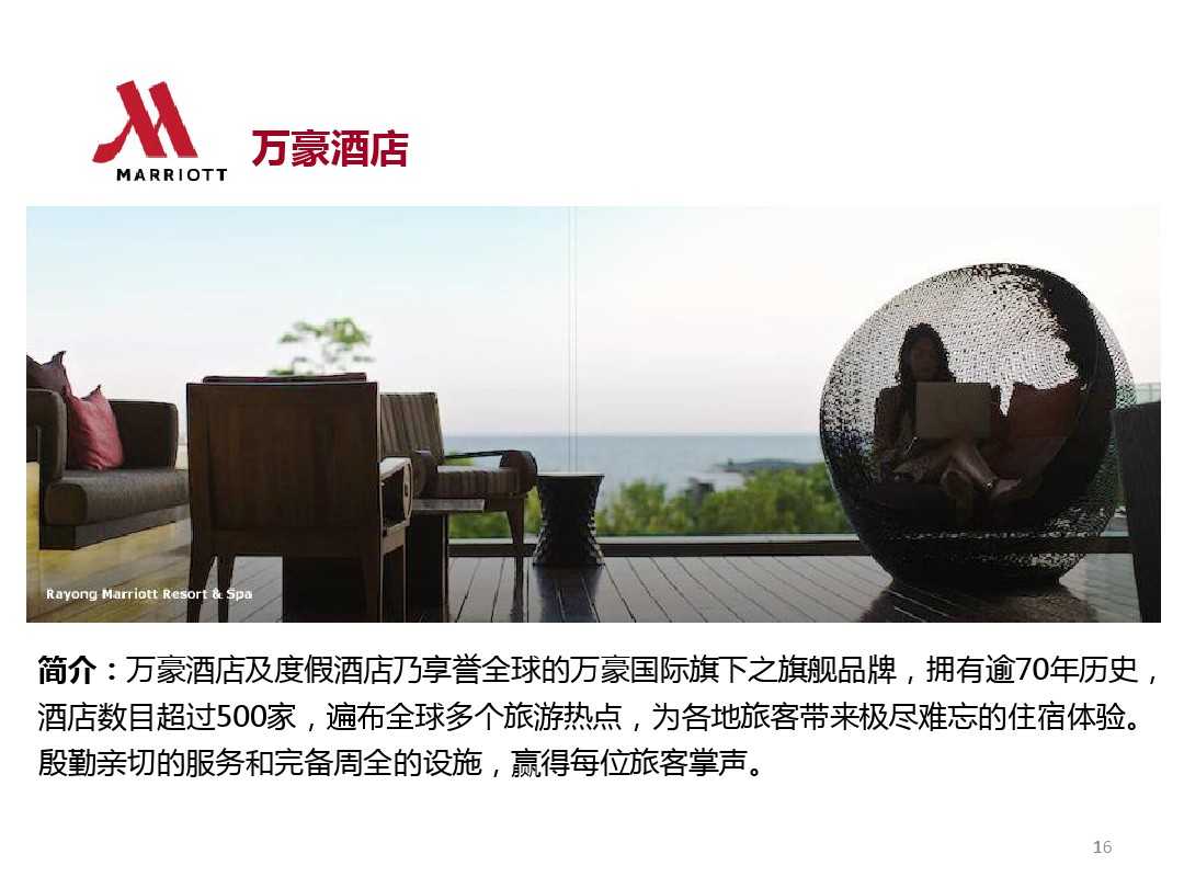 萬豪國際酒店集團公司是全球首屈一指的國際酒店管理集團公司,總部在美國的馬里蘭州貝塞斯達。旗下有著眾多的知名酒店品牌產業,遍布全球130多個國家和地區,長期經營酒店為集團積累了大量的酒店管理經驗和技術人員儲備。