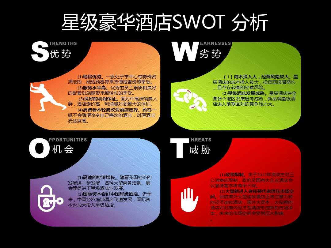 當然,凡是有利必有弊。在酒店行業這個龐大的產業鏈支撐起的商業帝國,當中又會遇到哪些不利的因素呢?用四個關鍵詞來分析其中面臨的問題:哪四個關鍵詞呢?既下列圖中所示中的SWTO問題。