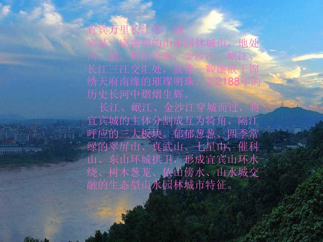 宜賓是一座典型的山水園林城市,是川、滇、黔三省交匯結合的地方,金沙江、岷江、長江三江交接匯集的地方,就好比一顆鑲嵌于錦繡天府南源的璀璨明珠在二千多年的歷史長河中煜煜生輝。宜賓積淀了豐厚的古跡文化,可上溯秦漢,下覓明清,可探謎千年古剎,可尋蹤神秘古道,可憑吊兩千年物是人非之滄桑,可唱和八百年遷客騷人之風雅。