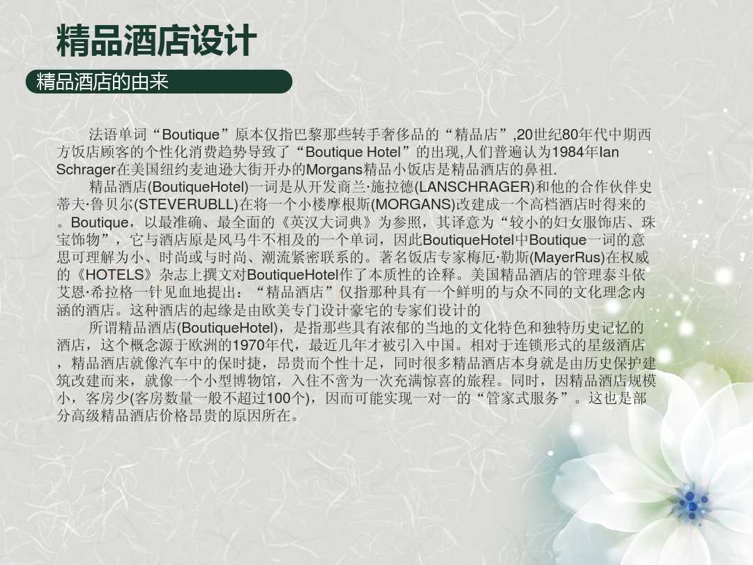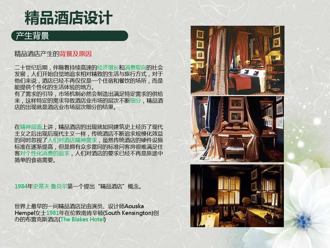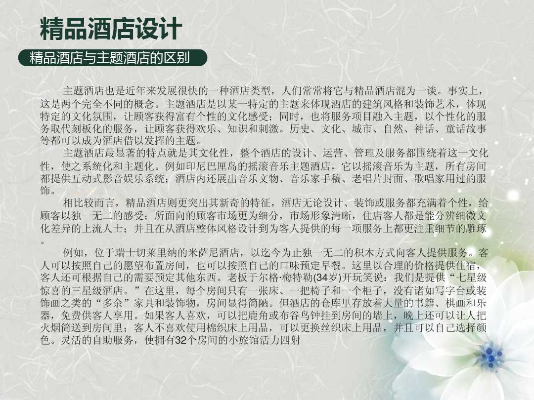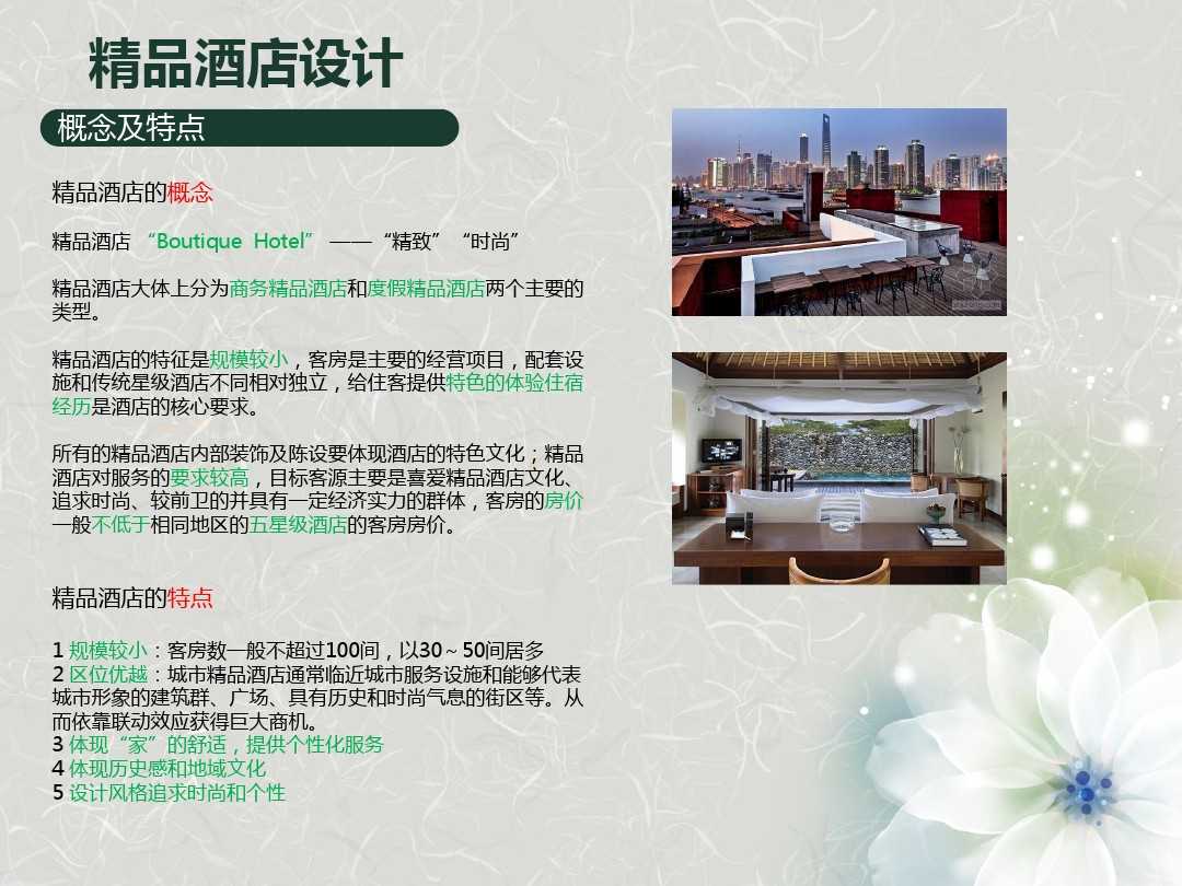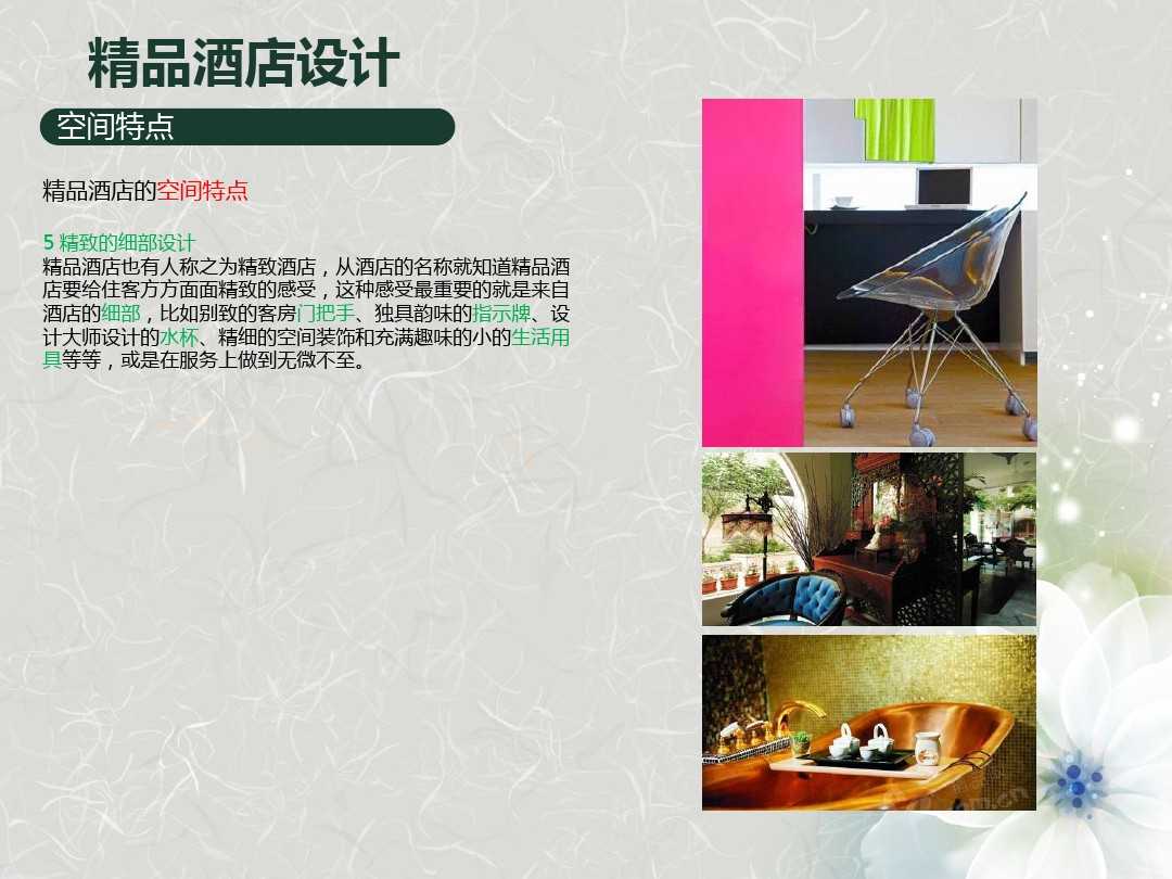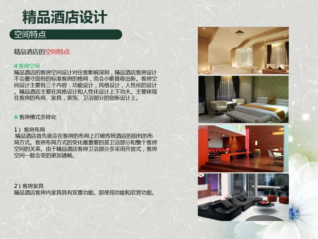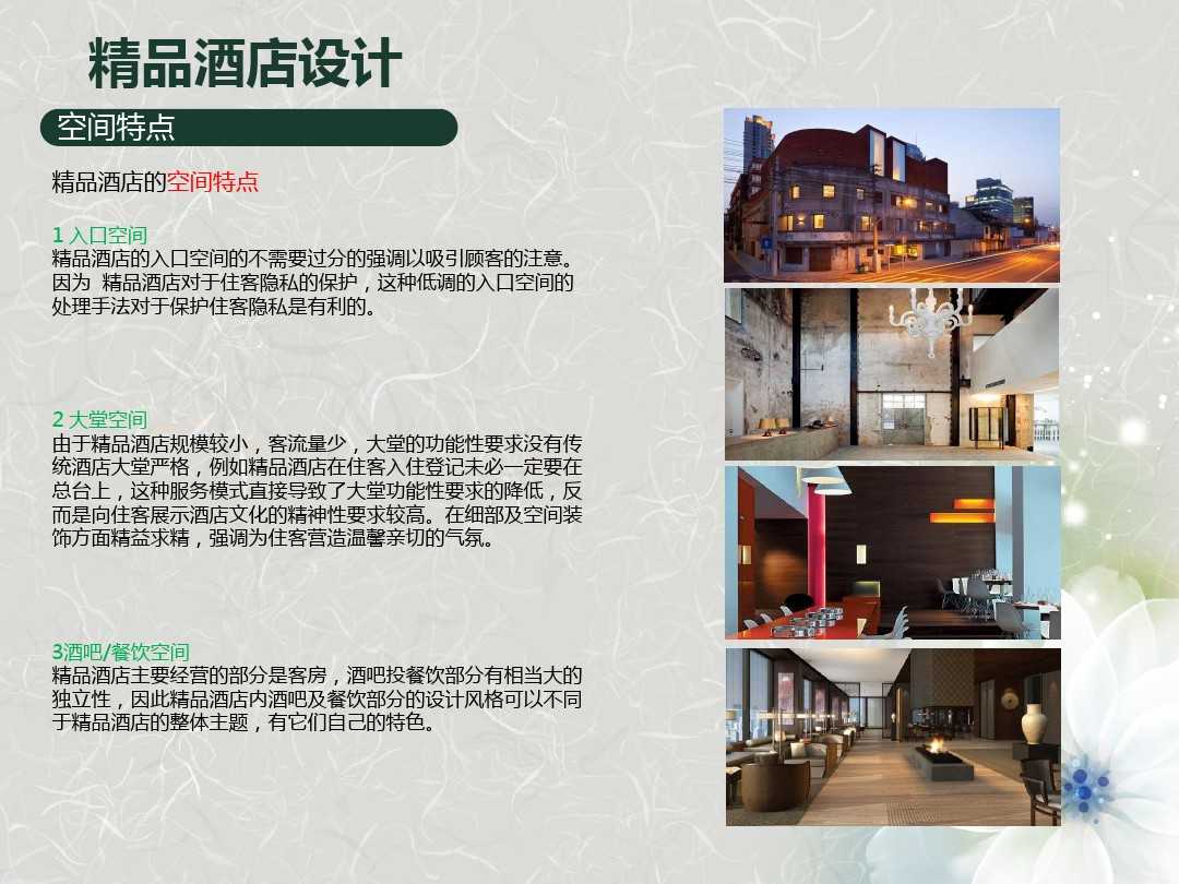 在做精品酒店設(shè)計的時候,關(guān)鍵是要如何對精品酒店進(jìn)行定位。精品酒店究竟“精”在何處,與其他主題酒店有著什么樣的區(qū)別。當(dāng)我們明白了什么是精品酒店與其他酒店的區(qū)別之后,相信再去參與精品酒店的建設(shè)工作也不是什么難事了。