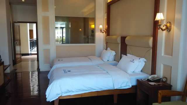 走廊時同樣使用的是藍黃色調,酒店設計最重要的原則之一就是要保證酒店設計的統一,因此走廊不規則的圖案便于大堂的圖案相一致;燈光采用黃色燈罩來遮光,避免了燈太亮的刺激感,同時增加了舒適感;走廊的頂上面使用金黃色的蝴蝶裝飾點綴,如同漫步在天空與海洋之間一樣,有一絲活潑俏皮的感覺。