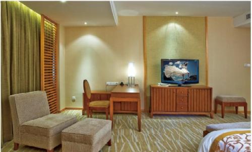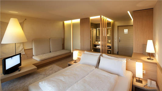 4、家具:考慮到投資成本上的控制,一般現代派酒店客房較少采用全實木家具,建議使用表面為天然材質的人造板結合實木制作或人造板結合金屬、石材、玻璃等材料。寫字臺、電視柜、行李柜、床頭柜、茶幾等平整的臺板和立面部分的表層主要使用人造板,收邊和腳、腿等支撐或獨立部分使用實木;切忌再在臥室中使用化妝鏡,試問:按以往設計的昏暗的客房里,有哪位女士會坐在臥室的化妝鏡前化妝而不到明亮的衛生間里的大面鏡子跟前?另外,從風水的角度說,中國人是最忌諱鏡子對著床的;全身鏡也不要設計在臥室中;有相當數量的五星級酒店,其客房床頭一面的墻壁上也對稱型地設計了局部鏡面,有的是靠近頂棚的一塊長方型,有的是分立兩床頭柜上方。按風水講,臥室有鏡面不利;第二:容易讓人產生幻覺受驚嚇;第三:容易損壞不方便維修;第四:可能會對客人造成人身傷害;所有家具的角都應做成鈍角或倒成圓角;床靠背不做成固定軟靠式,否則不易清洗。