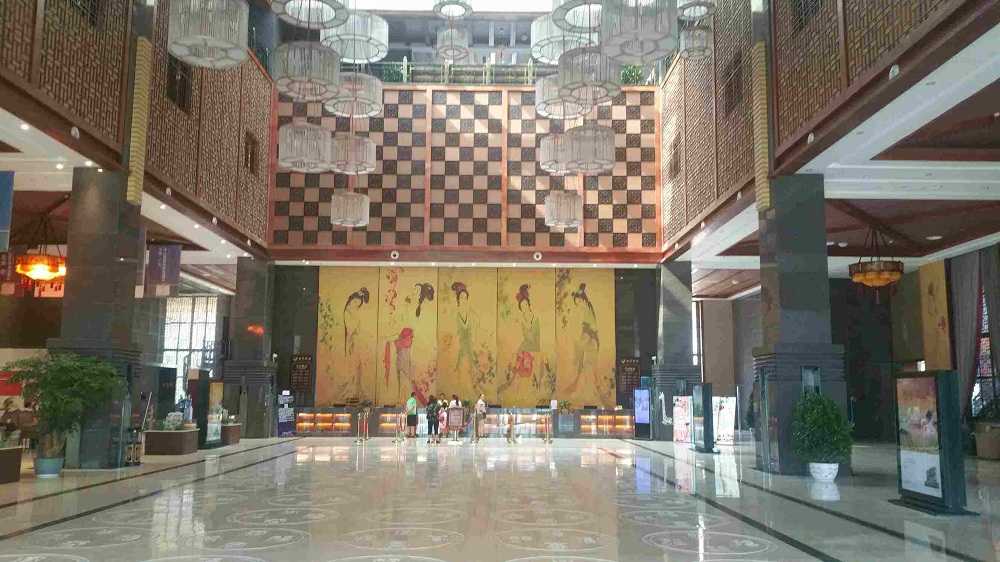 酒店的內(nèi)部采用女皇富饒時期的風(fēng)格,進門一龍一鳳的金屬雕塑,寓意當(dāng)年二圣臨朝。主樓一層為接待大堂,地磚采用定制的銅錢紋樣,墻面鐫刻女皇執(zhí)政時期創(chuàng)造的文字,頂面奢華的燈具排列為“曌”字,象征日月凌空,普照大地。洗浴等待和休閑飲茶等區(qū)域的細節(jié)設(shè)計也極具宮廷氣質(zhì)和中式韻味,青瓦木梁,長圓門洞,石體浮雕和木質(zhì)鏤空隔斷,搭配造型別致的宮燈和絲綢簾幕,讓人仿佛身置古代。將牡丹、佛像、錦鯉等意向融入設(shè)計,墻面飾有仕女圖、山河景等壁畫,讓人恍然夢回唐朝。古香古色的空間與一些現(xiàn)代材質(zhì)協(xié)調(diào)一致,營造出酒店綜合體華麗大氣的舒適氛圍。