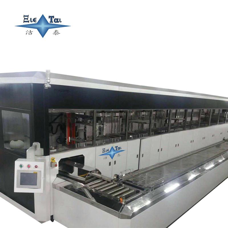 潔泰龍門臂超聲波清洗機(jī),是一款全自動(dòng),清洗過程由微控控制,5個(gè)由SUS316材質(zhì)制作的清洗槽,漂洗槽、烘干槽組成的一條連續(xù)工作的裝置。操作者將裝有工件的清洗籃放置在進(jìn)料輸送滾道上,輸送滾道將清洗籃送往上料工位,機(jī)械手依次將清洗籃送往各清洗槽,對(duì)工件進(jìn)展熱浸洗、超聲粗洗、超聲精洗、蒸汽浴洗及熱風(fēng)烘干,第一到五槽的熱浸洗、超聲波粗洗、超聲波精洗、蒸汽浴洗、熱風(fēng)烘干過程中,清洗籃旋轉(zhuǎn)機(jī)構(gòu)使清洗藍(lán)始終處于旋轉(zhuǎn)狀態(tài),使工件充分得到清洗,提升過程中洗籃也始終處于旋轉(zhuǎn)狀態(tài),并在冷凍區(qū)停留一段時(shí)間,使清洗液脫離工件流回清洗槽,工件橫移機(jī)構(gòu)負(fù)責(zé)將工件挪動(dòng)一個(gè)工位,出料輸送滾道將清洗好的工件送往出口,操作者在出口處將工件卸下,翻開洗籃將工件道入器皿,清洗既告完成。